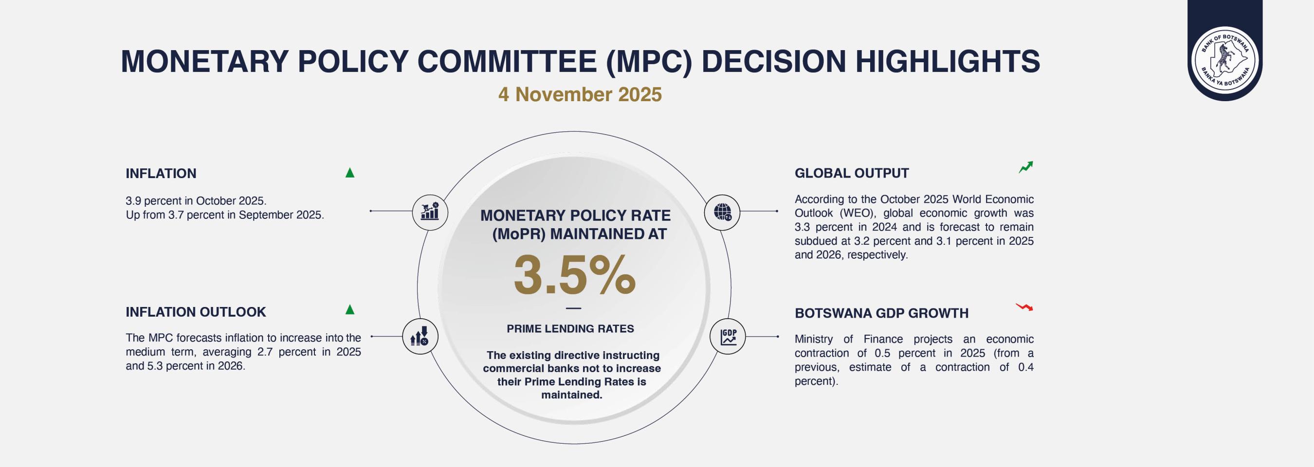 The Bank maintains the capability to analyse all key economic policy issues that impact on the economy of Botswana, including both domestic and international developments.
